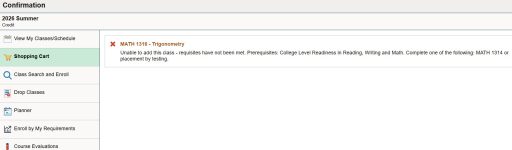 I registered for MATH 2413 Calculus I for Spring 2026, but I couldn’t sign up for MATH 1316 Trigonometry in Summer I 2026 because I hadn’t completed MATH 1314 College Algebra, as required by the registration system.