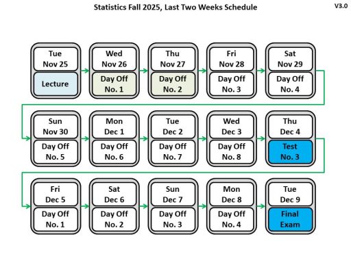 I have an exam. No. 3 on Thursday, December 4, and the Final exam on December 9. Preparing well and understanding the material will help me succeed.