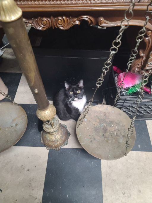I took this picture today (Dec 5, 2025). This is my friend’s mechanic shop kitty cat. She is very lovely, and I like her a lot.